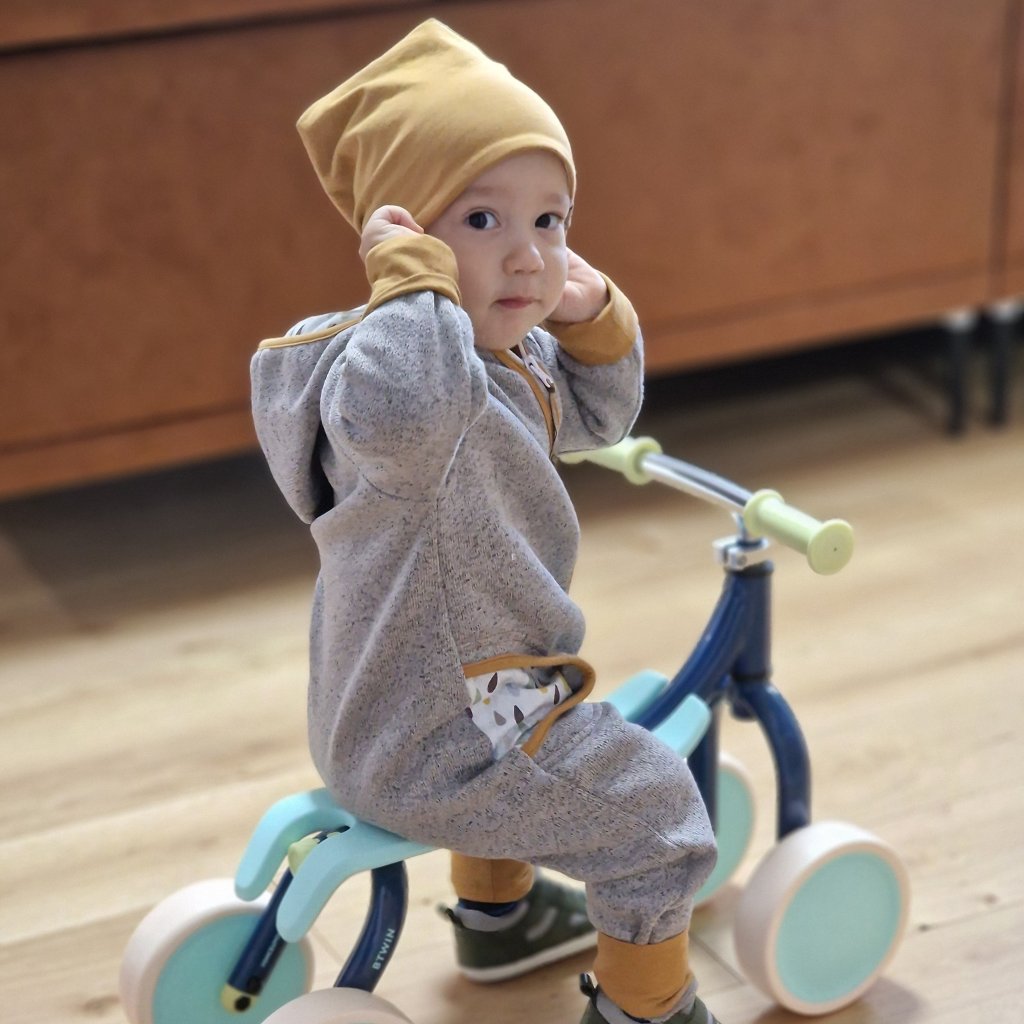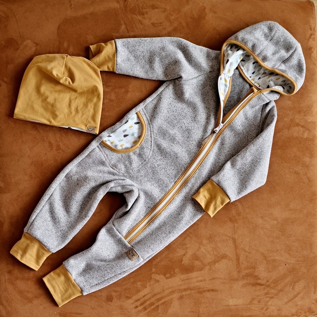 Tento hrejivý overal je ušitý z mäkkej fleecovej svetroviny, ktorá poskytuje príjemné teplo a vysoký komfort pri nosení. Materiál je poddajný, jemný na dotyk a ideálny pre deti, ktoré trávia veľa času v nosiči, kočíku alebo autosedačke, ale aj pre už aktívne deti.