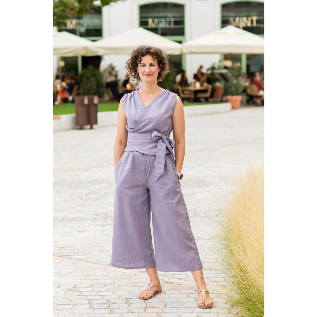 Vďaka zavinovaniu sa top krásne prispôsobí minimálne dvom konfekčným veľkostiam, dojčiace mamičky pohodlne nadojčia bábätko, zaväzovací opasok zvýrazní váš ženský pás a vzdušné široké kulotky vám dodajú šmrnc.